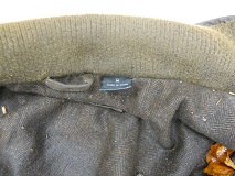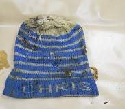 Dark Blue dress socks, Dark Brown Canvas 'St. John's Bay' jacket, size medium. Blue and White knit cap with the name "CHRIS" knitted into the design.