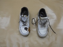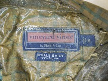 Clothing: Blue and White plaid 'Vineyard Vines' Whale shirt. - long sleeve, button down collar, size Medium Khaki 'St John's Bay' trousers - 33W-30L White 'New Balance' Sneakers - Model 811, size 10EE