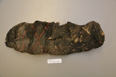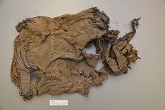 Clothing: Remnants of material, possibly a shirt; remnants of the waistband of a pair of pants, pockets still attached, found to be empty; remnants of the lower aspect of a pair of grey and white checked pants; remnants of a pair of black socks with red and white diagonal stripes.